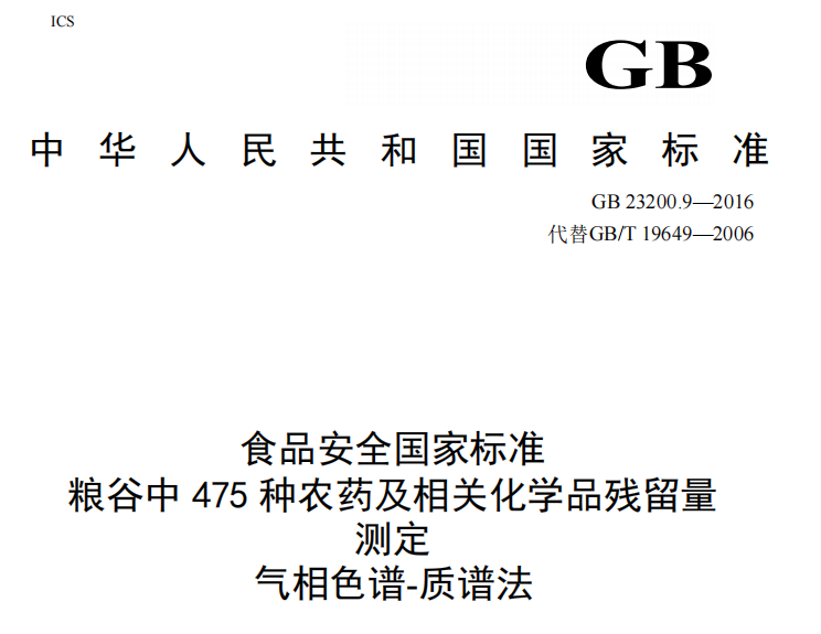 GB 23200.9-2016 糧谷中475種農藥及相關化學品殘留量的測定-氣相色譜質譜法 更新日期:2022-12-30 下載包(1)